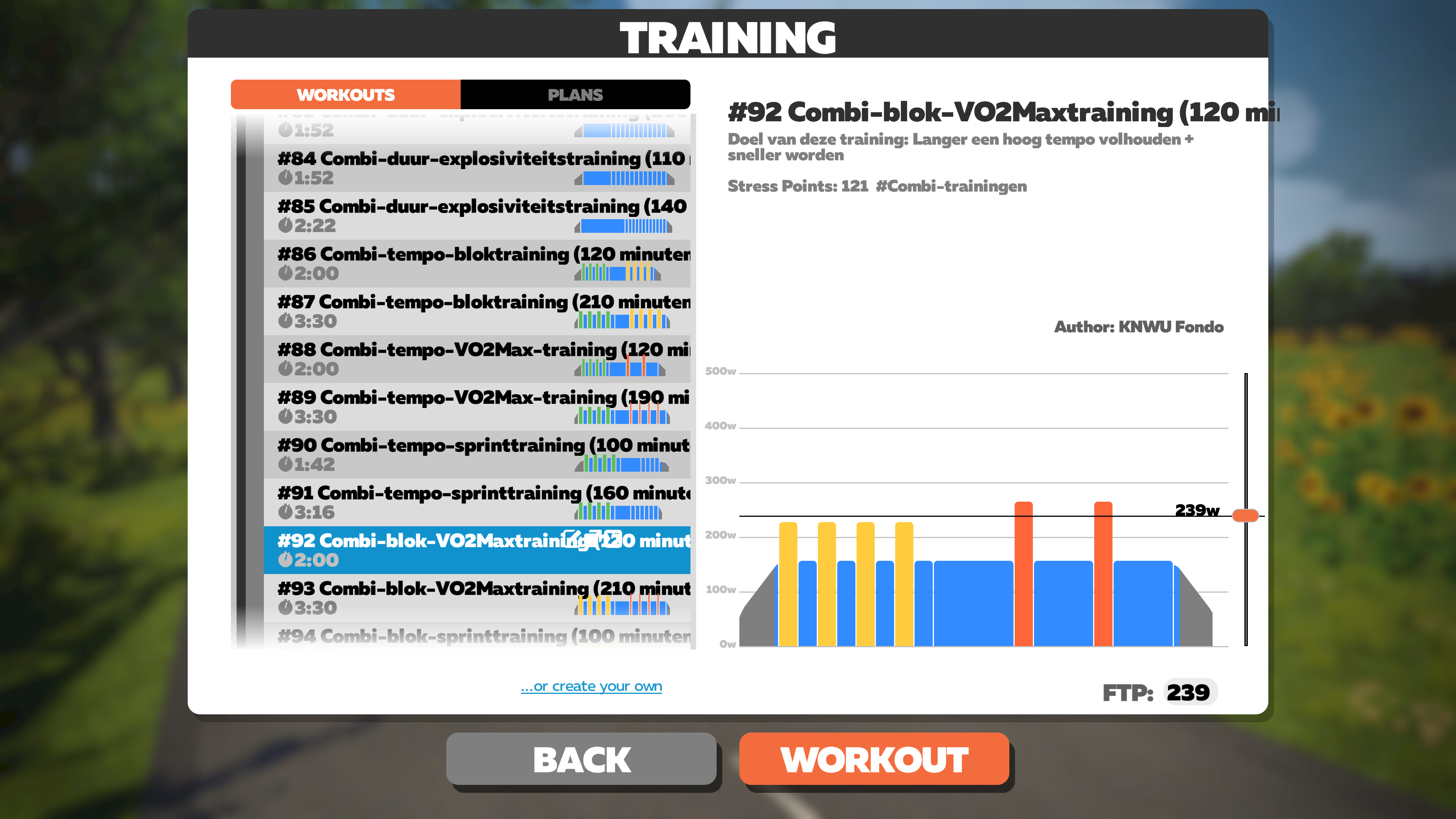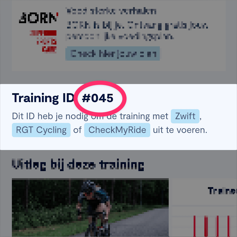 Na het instellen van je FTP kun je echt aan de slag met de Fondo-trainingen. Om te weten welke training je moet kiezen uit de lange lijst met trainingen in Zwift gebruik je het 'Training ID’ van de training uit Fondo. Dit ID vind je onder de instructies van iedere training (zie afbeelding). Bijvoorbeeld '#013', '#078a', of '#104'. Vervolgens zoek je in de lijst met trainingen in Zwift de corresponderende training op. Selecteer de training en kies ‘WORKOUT’. Je kunt nu beginnen met fietsen en Zwift zal je gedurende de training van instructies en feedback voorzien. Succes met trainen en vergeet deze na afloop niet af te vinken!